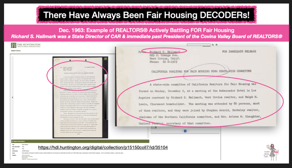 In California specifically, a small, dissenting remnant of Realtor members, including some leadership (like Richard Hallmark, a state director of the California Association of Realtors and past president of Covina Valley Board of Realtors), supported and advocated for fair housing at that notoriously precarious time, as shown in the following excerpts from my Fair Housing DECODER seminar presentation slides.