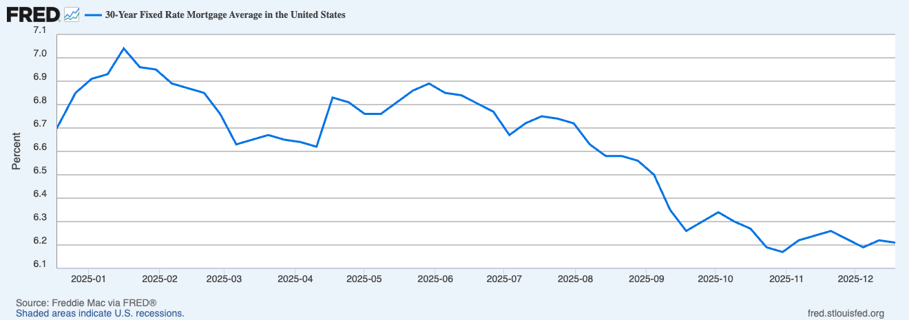 Over the course of 2025, Americans saw short-term interest rates drop three times, ultimately bringing down the average 30-year fixed rate from a high of 7.04 percent in January 2025 to around 6.2 percent by late December 2025, according to the Federal Reserve Bank of St. Louis.